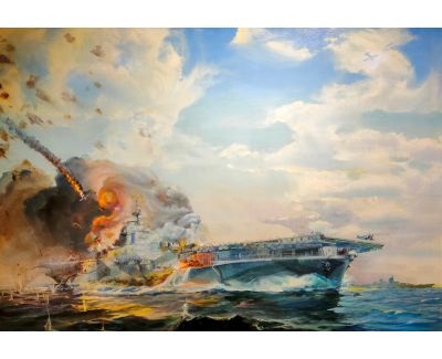 除了模型外,長榮海事博物館3F同步展出「無畏號」的畫作,栩栩如生描繪當時激烈的戰鬥,作者也在海浪中留了一個小彩蛋等待大家發現。