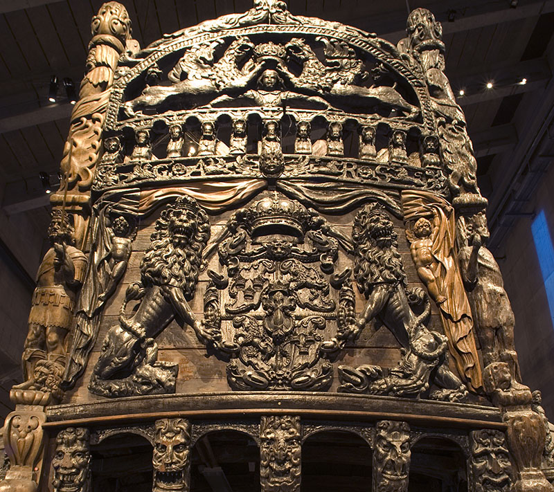 瓦薩號船上有約700件精美的雕刻,其中船艉雕刻的最上層是少年時期的瑞典國王古斯塔夫二世,張開他的手臂迎接瑞典的子民;下面有舊約聖經中打敗強敵的英雄:基甸和大衛,也有希臘羅馬時期的各種英雄形象雕刻在船上。經考證,這些雕刻在瓦薩號下水時都是五顏六色的,甚至有些還鑲金,非常美麗!